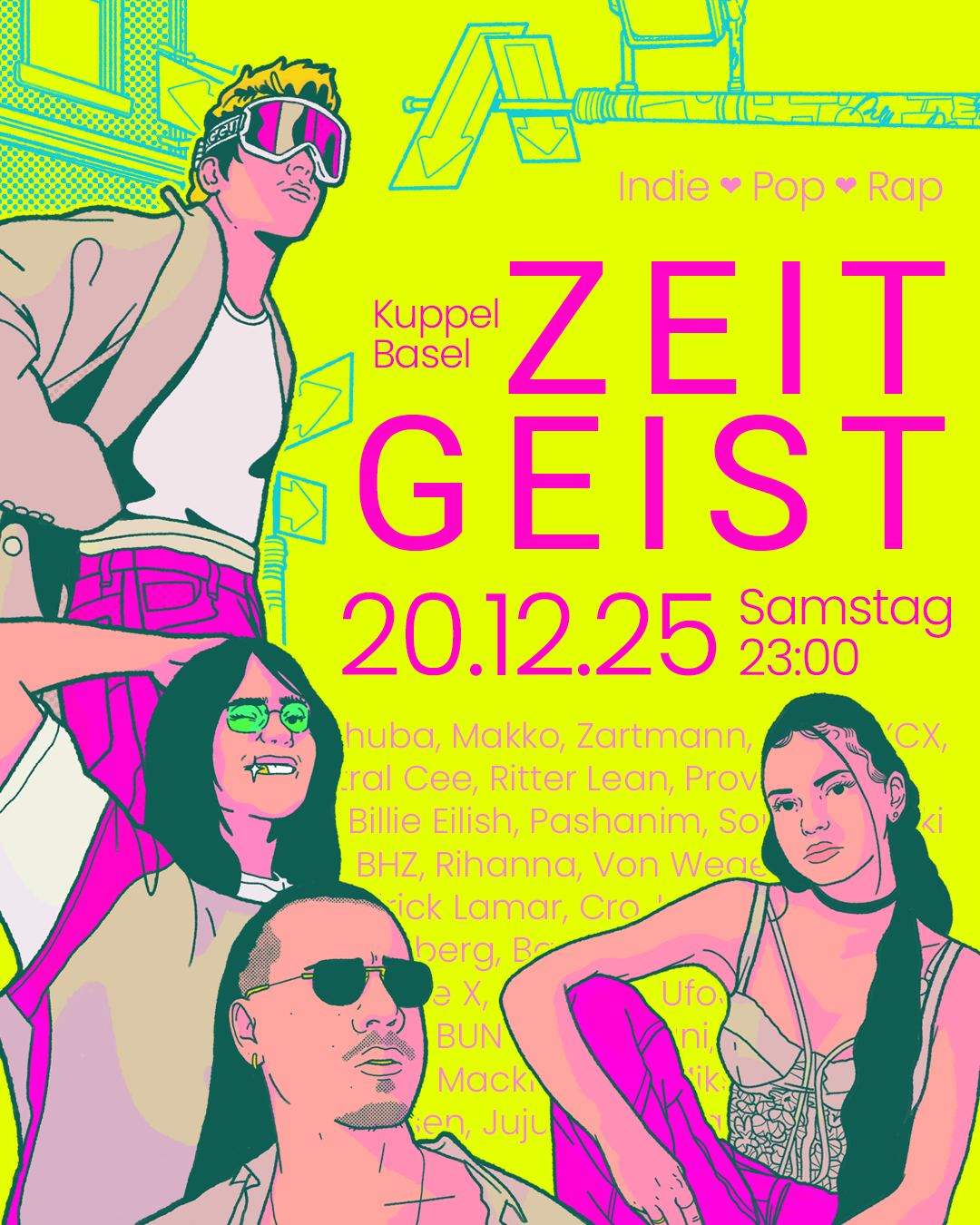 An der Zeitgeist-Party tanzt du zu den aktuellsten Hits der Welt. Egal ob Pop von Charli XCX, Dance-Hits von Ikkimel, Rap von Apache207 oder Indie-Banger von Zartmann. Wir haben die Tracks aus deiner Playlist und du bringst deine besten Dance Moves zu uns in den Club. Deal?